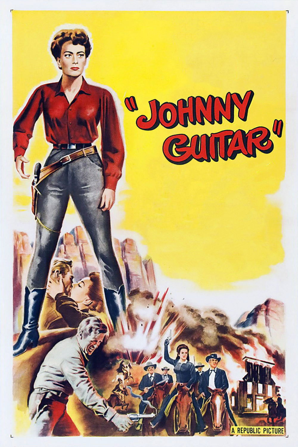 You're nothing but a railroad tramp who's not fit to live amongst decent people. Johnny Guitar is out of Republic Pictures and is directed by Nicholas Ray. It's written by Phillip Yordan, who adapts from a novel written by Roy Chanslor, and it stars Joan Crawford, Sterling Hayden, Mercedes McCambridge, Ward Bond, Er...